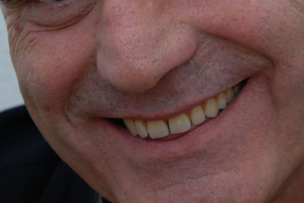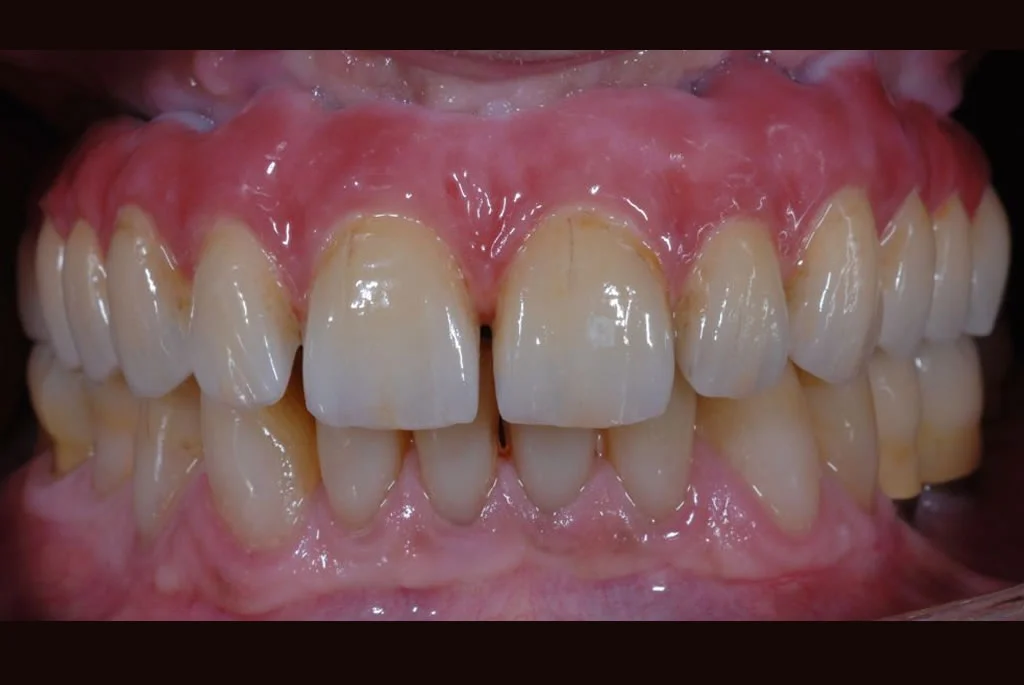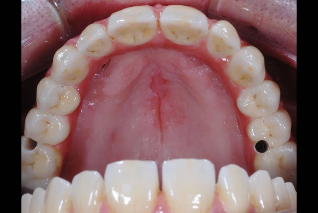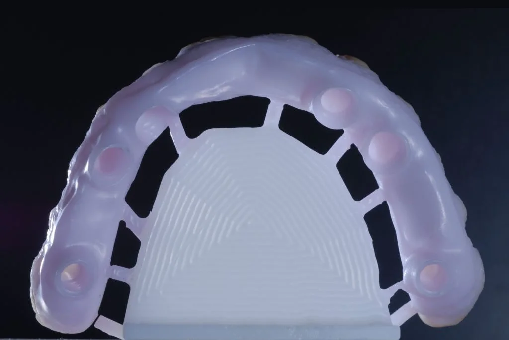 Die sechs Implantate wurden im Vorfeld mit einem Langzeitprovisorium aus Hochleistungskunststoff versorgt. In dieser Testphase konnte der Patient voll und ganz die Vorteile dieser Versorgungsform ausprobieren in Sprache, Optik und Reinigung.
