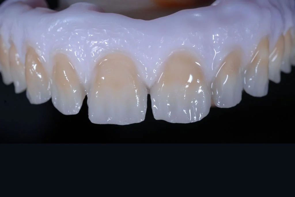 Aus der gewonnenen Provisorium- Endform, wurde nun mit modernster CAD/CAM Technik ein Zirkongerüst gefräßt, danach hochtemperiert gesintert und anschließend keramisch verblendet.